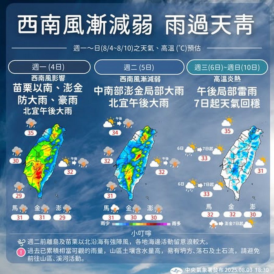 隨著西南氣流的減弱,中南部降雨逐漸趨緩,氣象署預測,明天8月5日西南風逐漸減弱,但水氣仍多,中南部地區仍有短暫陣雨或雷雨,清晨至上午有局部大雨發生的機率,其他地區為多雲,午後北部、宜蘭、花蓮地區及臺東山區易有雷陣雨發生,特別在桃園以北地區及竹苗、宜蘭山區有大雨發生的機率,建議外出攜帶雨具;因連日降雨,山區特別留意坍方、落石等現象,非必要請避免前往山區或溪河活動。