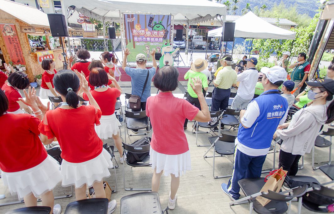 ▲呼應草嶺富含多樣天然生態,主持人換上俏皮青蛙裝與現場民眾歡欣又唱又跳。(圖/雲林縣政府提供)