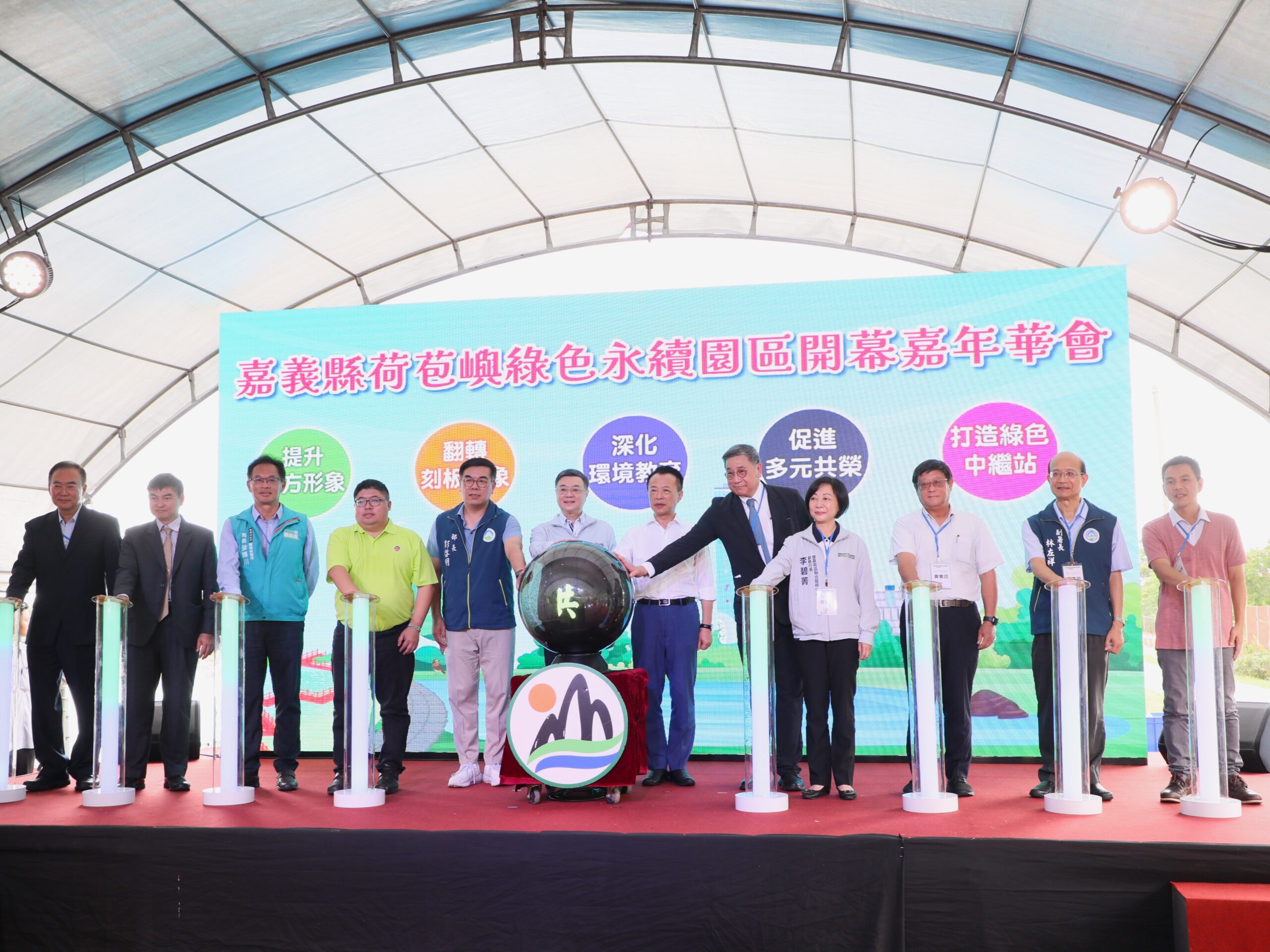 嘉義縣荷苞嶼綠色永續園區21日舉辦開幕嘉年華,行政院長卓榮泰、環境部長彭啓明與嘉義縣長翁章梁、環保局長張輝川及達和鹿草環保公司代表台泥企業團董事長張安平等人,共同為園區揭幕,不僅宣告全台首座由焚化廠轉型升級的環境教育園區正式啟用,更彰顯台灣在循環經濟與環境永續發展上,由中央引領、地方實踐的卓越成果。