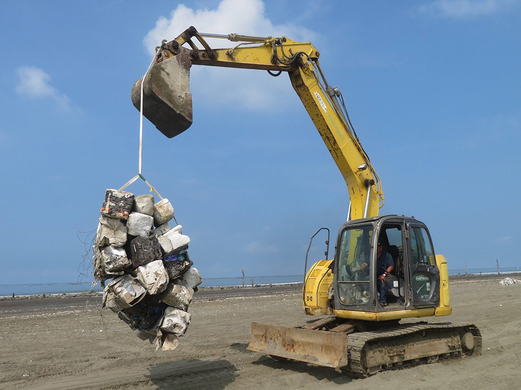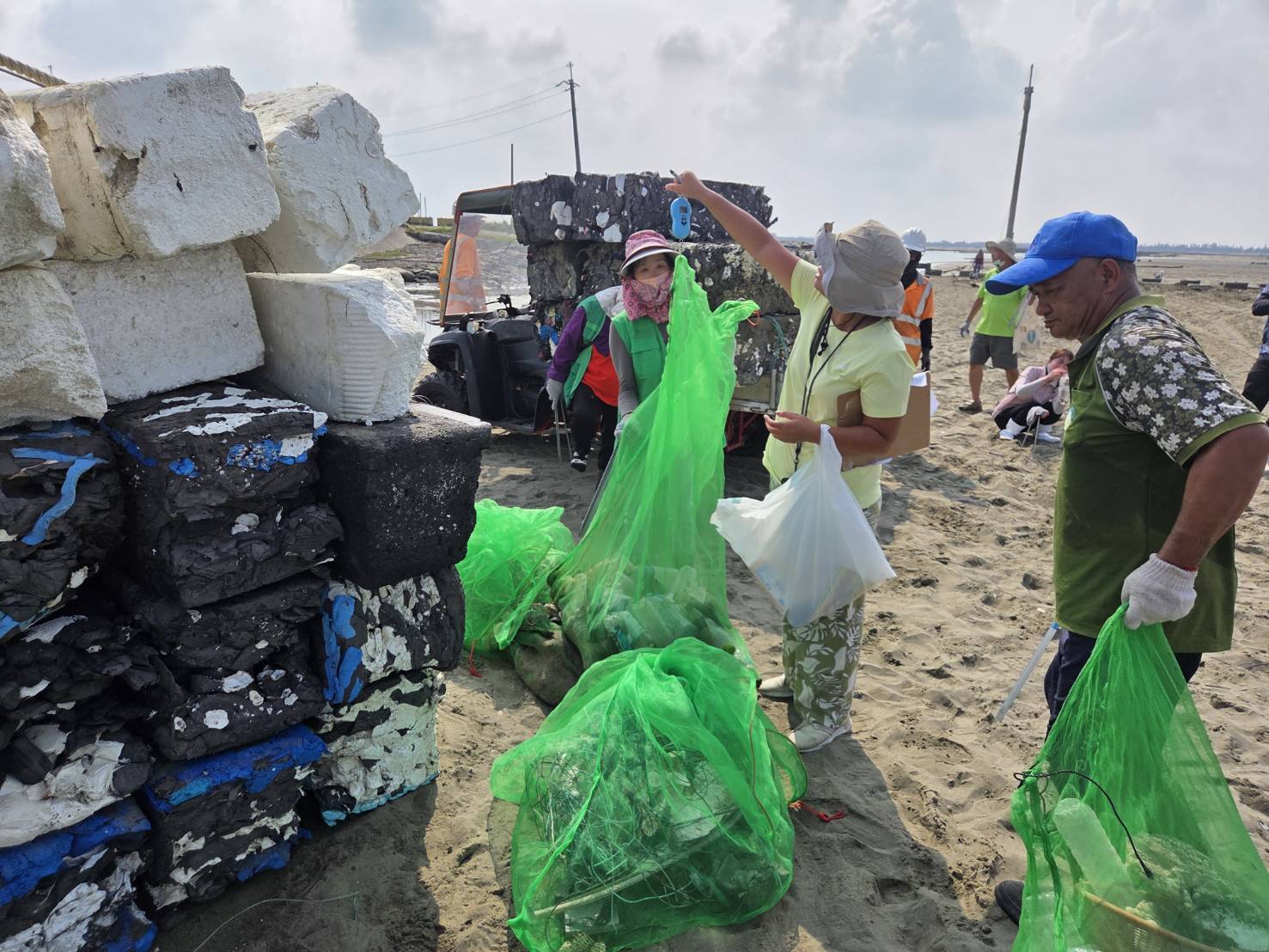 今日由東石鄉長林俊雄、環保局長張輝川率隊,出動大型機具4台挖掘機、2台回收車、1台抓斗車、1台鏟斗車及2台沙灘車,共85人參與,清除的海洋廢棄物包括200個再生壓縮泡棉浮具、150個廢棄保麗龍、15個廢棄浮球,34公斤等一般垃圾,以及159公斤資源回收物。