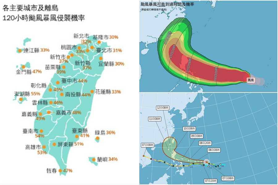 氣象署目前預報資料顯示,鳳凰颱風未來120小時的暴風侵襲機率,中部、南部及金門、澎湖、臺東等縣市都超過4成及5成,其中澎湖高達55%、臺南54%、高雄53%、屏51%。