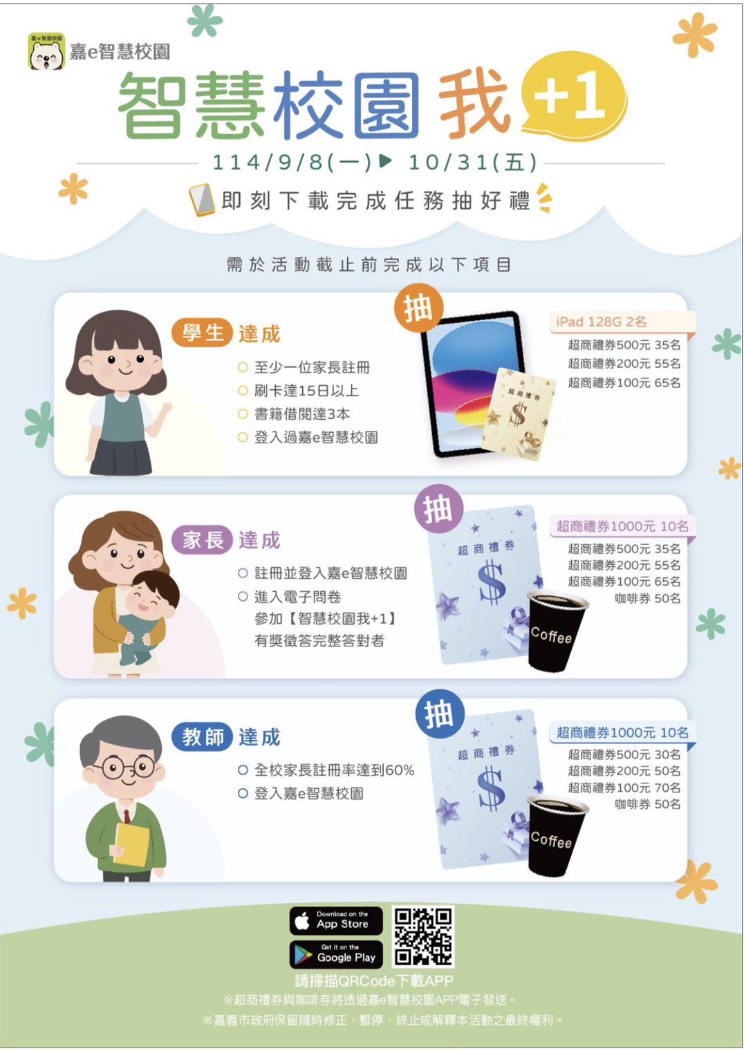 郭添財進一步表示,本次活動獎項豐富,是對支持智慧校園建設的最佳回饋。透過各校推廣家長、學生、教師踴躍使用平台,讓「嘉e智慧校園」APP成為親師生最貼心的溝通與學習工具,未來也會持續推動各模組之優化,透過科技助力,促使家長、學生、教師習慣數位工具與智能應用。強化校園與家庭間資訊流通,使教育更有透明度、互動性。
