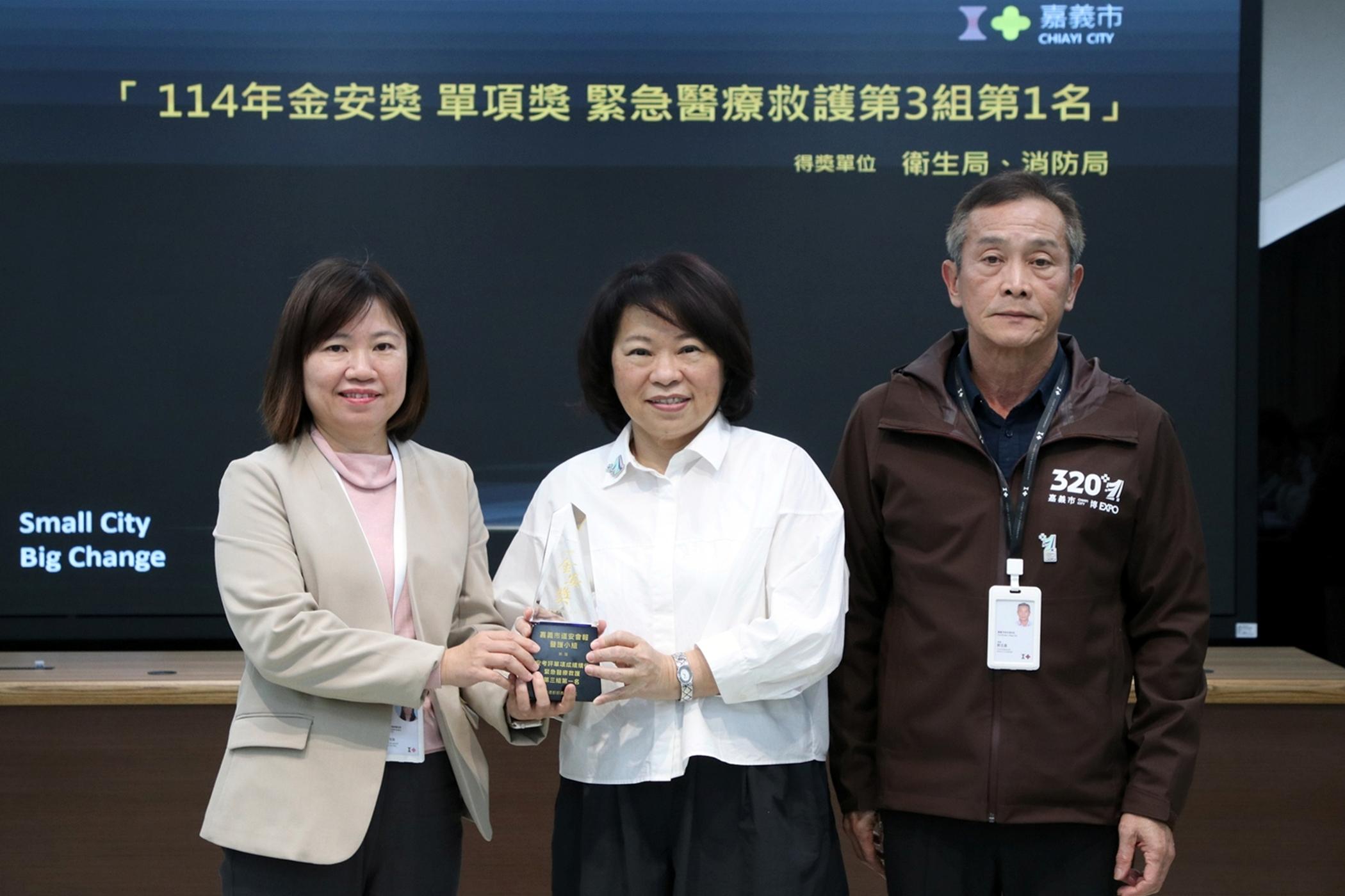 ▲嘉義市衛生局與消防局獲頒114年交通部「金安獎」緊急醫療救護第三組第一名。(圖/嘉義市政府提供)