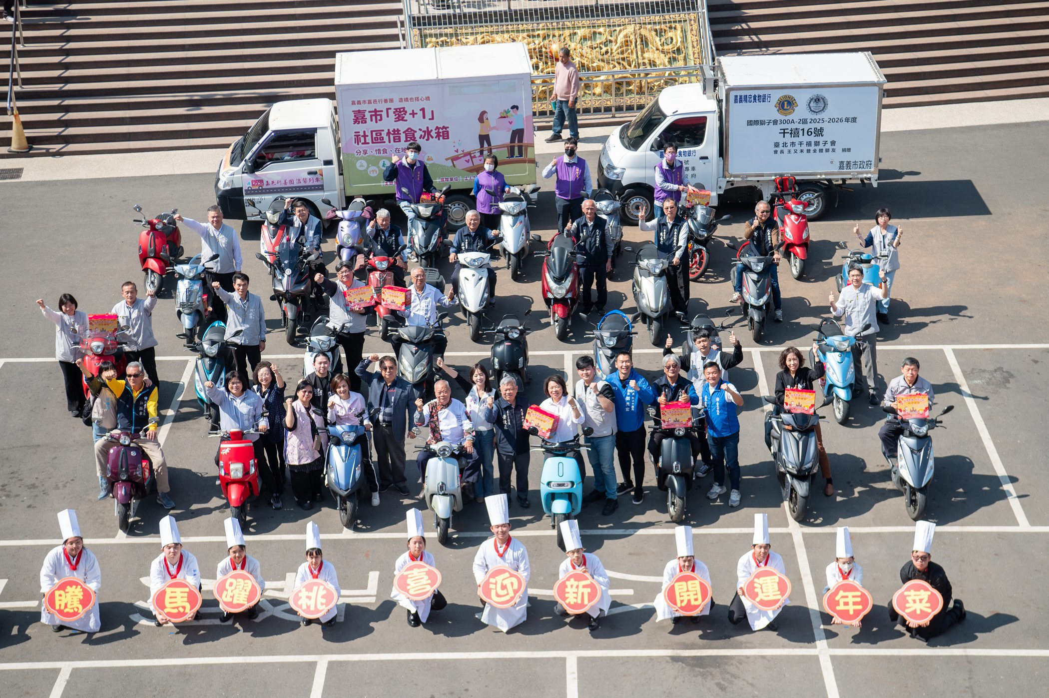 年節將近,嘉義市政府今(12)日攜手九華山地藏庵舉辦「龍騰馬躍 桃喜迎新」開運年菜捐贈活動,由嘉義市餐飲業職業工會協助料理,募集豐盛年菜及祈福物資,送至420戶弱勢邊緣戶與獨居長者手中,讓他們也能溫馨團圓。活動現場更由崇仁醫護管理專科學校餐飲管理科學生獻上精彩年菜上菜秀,現場氣氛熱鬧溫馨,黃敏惠市長致謝各界善心,並強調所有人的愛心匯聚,讓年菜超越食物,成為愛的傳遞與社會「美好的總和」。