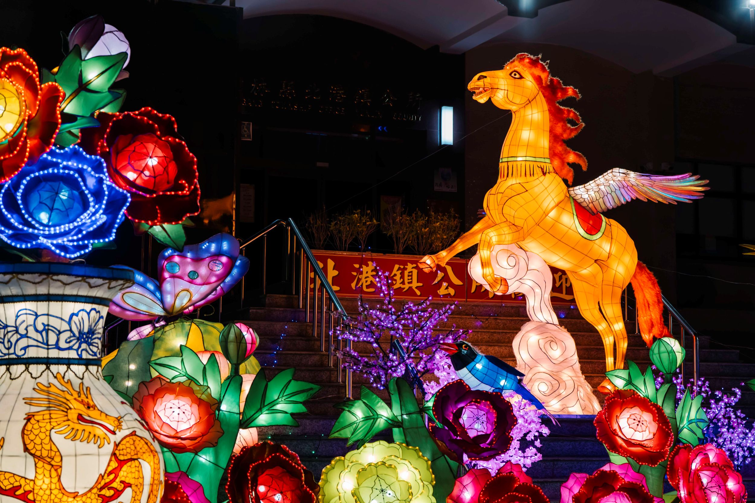 ▲「北港鎮公所燈區」主燈以展翅飛馬腳踏祥雲的造型,象徵勇往直前、好運啟航。(圖/雲林縣政府提供)