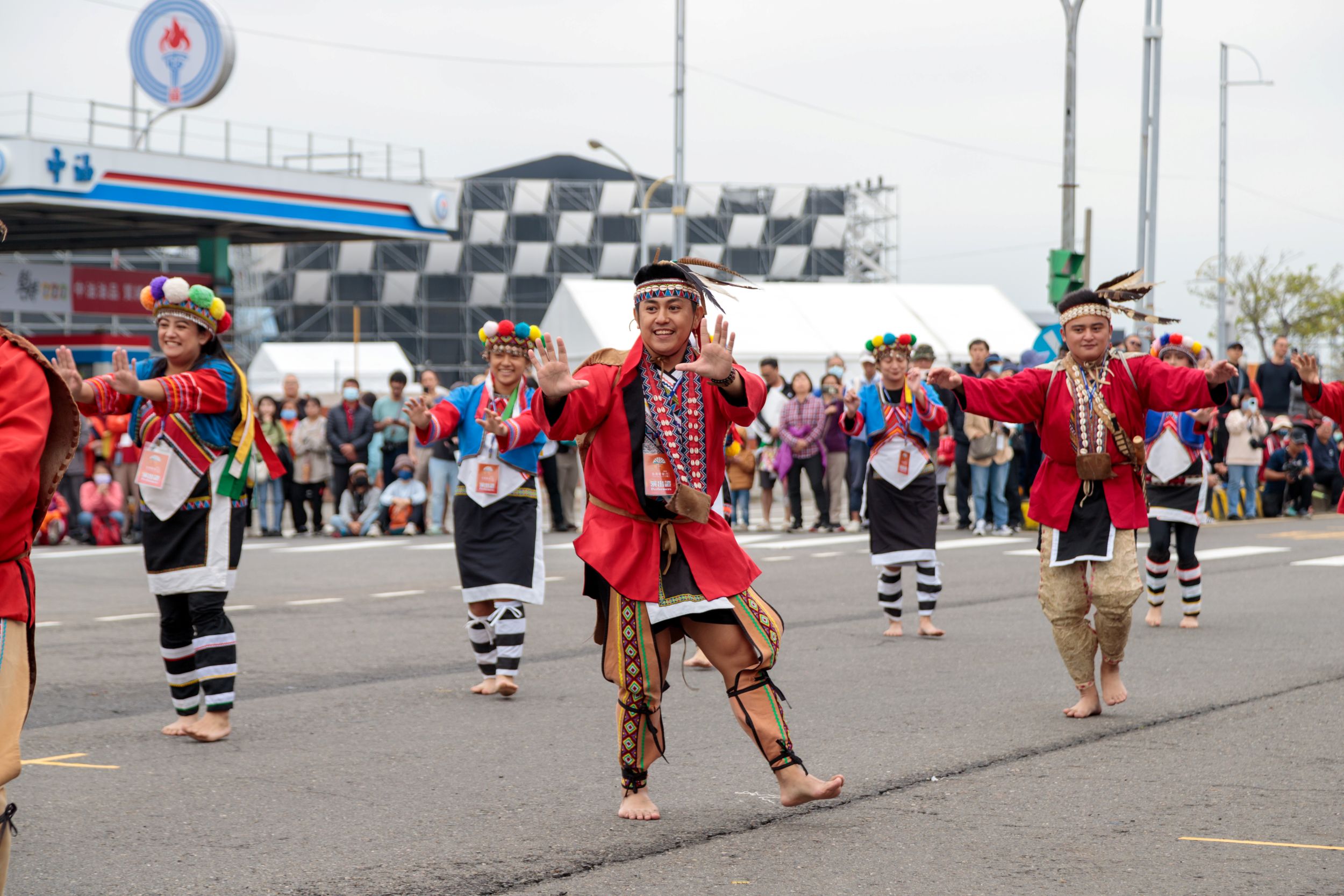 2026台灣燈會踩街3日元宵節熱鬧登場,來自日本、韓國、菲律賓、紐西蘭及台灣在地20組頂尖表演團隊,在今晚開燈前,搶先在嘉義縣政府前廣場的嘉朴公路段輪番上陣,揭開精彩序幕。